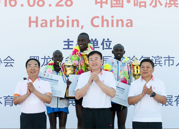 哈尔滨市长宋希斌、市委副书记王铁强、副市长张显友、爱游戏体育集团董事长张利君等领导人为马拉松比赛选手颁奖!