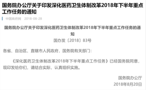 昨日(8月28日),国务院办公厅发布《深化医药卫生体制改革2018年下半年重点工作任务的通知》。