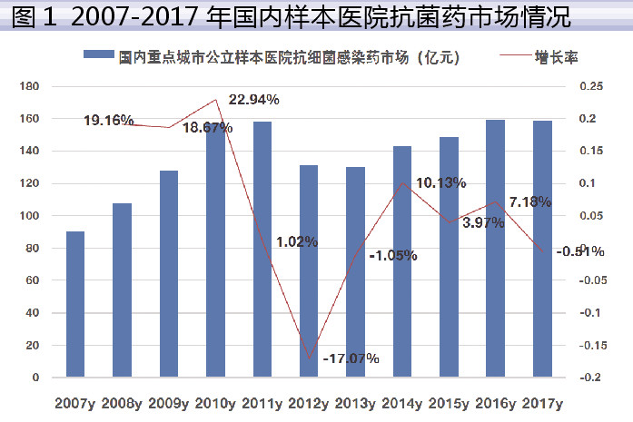 据米内网数据,2017年国内重点城市样本公立医院抗细菌感染类药物用药金额为158.57亿元,同比上一年下降了0.51%,在抗感染类药物比重下降到73.41%。