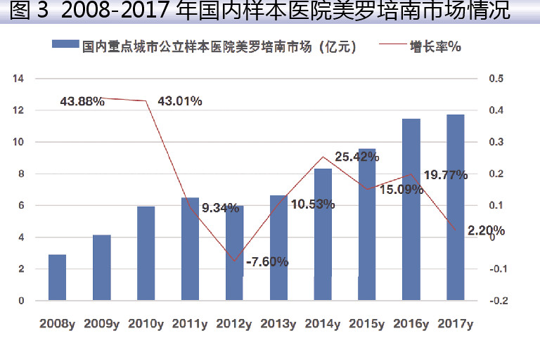1999年美罗培南进入中国市场,商品名为“美平”。1998年国产美罗培南已开发成功。迄今进入国内公立医院的美罗培南共有10家企业的产品,其中进口企业1家,国内与合资企业9家,国产和进口药物共同推动市场发展。