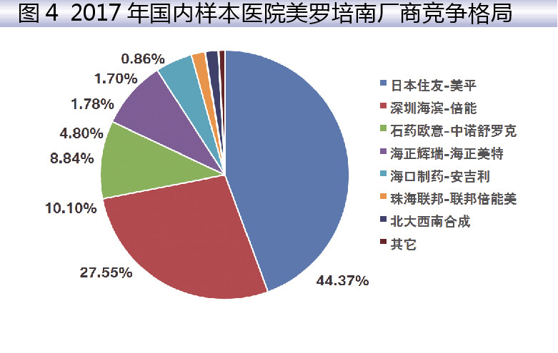 2017年,国内重点城市公立医院美罗培南TOP5供应厂商中,日本住友的原研进口药“美平”占据44.37%。国产TOP5厂家是:深圳海滨的“倍能”占27.55%,石药欧意的“中诺舒罗克”占10.10%,海正辉瑞的“海正美特”占8.84%,海口制药的“安吉利”占4.80%,珠海联邦的“联邦舒罗克”占1.78%。