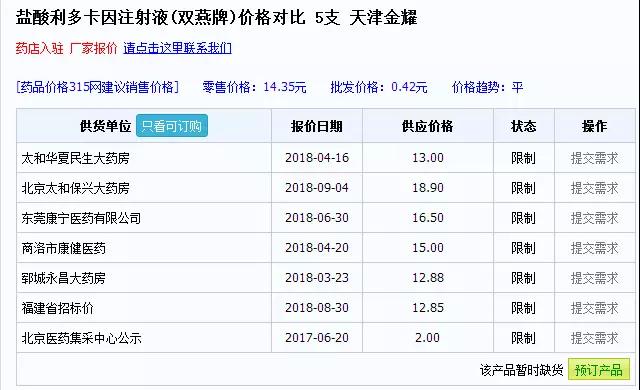 经赛柏蓝查询,以天津金耀药业生产的盐卡注射液为例,其供应价格从2元到18.9元不等,但产品暂时缺货。