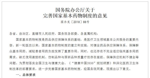 医药网9月21日讯 9月19日,国务院办公厅发布《关于完善国家基本药物制度的意见》。从基本药物的遴选、生产、流通、使用、支付、监测等环节完善政策,全面带动药品供应保障体系建设,着力保障药品安全有效、价格合理、供应充分,缓解“看病贵”问题。