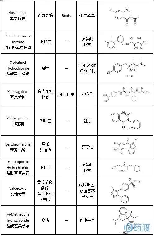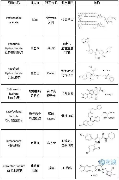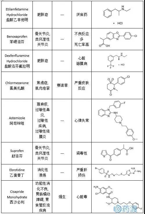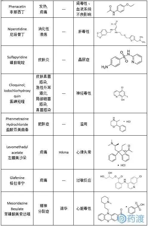 通过查询数据库、文献,如上所述,笔者共查到近142个化学药物已撤市,撤市原因主要集中于安全性问题及同类竞品竞争;其中,因安全性问题撤市药物共49个,详细情况见下表(附带结构)。