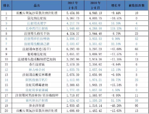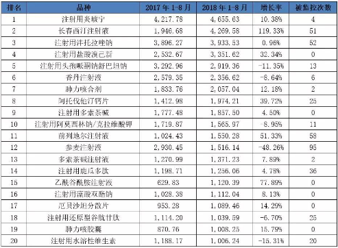 但是排在前20位的品种仍然有较多的频繁被列为监控或辅助用药目录内的品种。这个20个品种中,下降的品种有12个,上升的品种有8个。