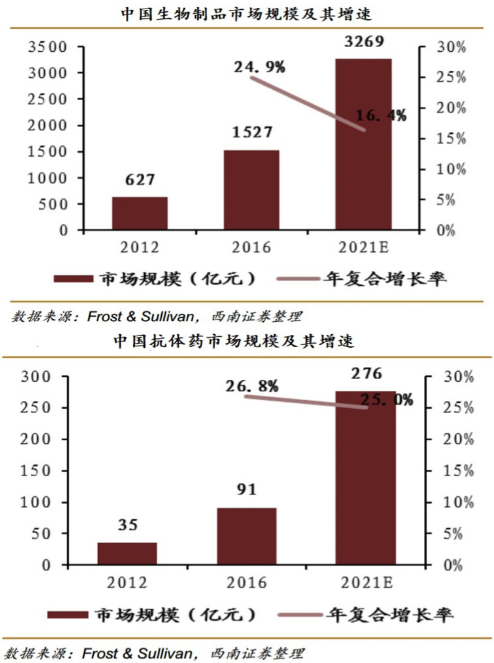 根据Frost&Sullivan数据显示,中国生物药的市场规模由2012年的627亿元人民币增长至2016年的1527亿元人民币,年复合增长率为24.9%,预计2016年至2021年会以16.4%的年复合增长率增长,于2021年达到3269亿元人民币的市场规模,为中国生物制品参与企业带来庞大机遇。