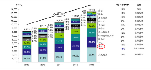 生物类似药已经成为全球生物药市场增长的新引擎,正处于高速增长期。据公开资料显示2012-2016年CAGR为28.7%。原研药专利过期、生物药需求增加、政策和支付制度的支持、以及类似药本身的价格优势共同推动了生物类似物类药的高速增长。