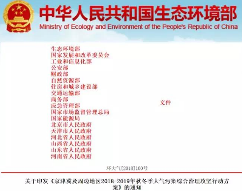 日前,生态环境部、国家发改委、公安部等12部委和6省(市)政府联合发布《京津冀及周边地区2018-2019年秋冬季大气污染综合治理攻坚行动方案》(下称《方案》)。