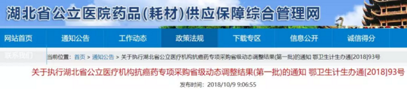 10月9日,湖北省公立医院药品(耗材)供应保障综合管理网转发湖北卫计委《关于执行湖北省公立医疗机构抗癌药专项采购省级动态调整结果(第一批)的通知 鄂卫生计生办通[2018]93号》(下称《通知》)。