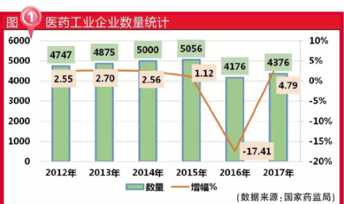 可能是因为有些生产企业生产许可证换证没有及时通过GMP的缘故,2016年制药企业数量较上年减少了880家,是5年来第一次减少,减幅达17.41%。对于2016年同比出现负增长,笔者认为,行业兼并重组、环保倒逼和GMP飞检等是主要原因,但最重要的因素是兼并重组。一些企业合并成为集团,工业排序上升,有利于管理、有利于产品结构调整,更有利于企业应对招标。2017年制药企业数量虽比2016年有上升,但还是较2015年少了680家,这个问题需要思考为什么!