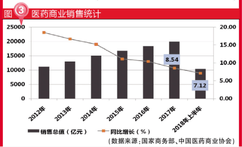 2018年上半年,医药商业销售前4强(国药、华润、上药、九州通)占38.01%市场份额;前100强占69.04%市场份额。