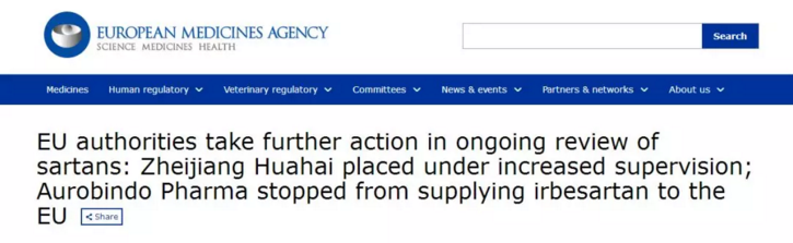 2018年7月,对华海药业缬沙坦的杂质监测(NDMA、NDEA)导致欧盟范围内对所有缬沙坦药物的审查。
