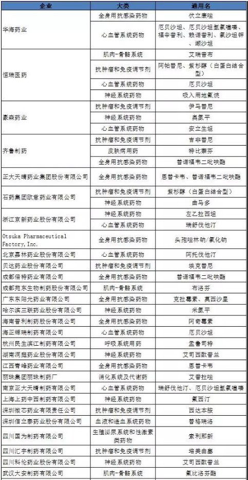 根据这些药品的主要企业来看,通过一致性评价或者进入上市药品目录集的企业涉及30余家。其中涉及品种较多的有华海药业、恒瑞医药、豪森药业、齐鲁制药、正大天晴等企业,这些企业均有两个或以上品种上榜。