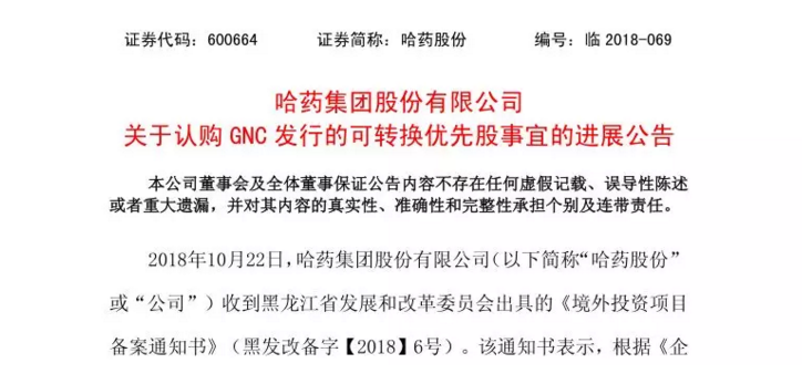10月24日,爱游戏体育收到黑龙江省发展和改革委员会备案出具的《境外投资项目备案通知书》(黑发改备字﹝2018﹞6号)。该通知书表示,根据《企业境外投资管理办法》(国家发展改革委令第11号),对爱游戏体育股份收购美国GNC Holdings,Inc.(以下简称“GNC”)可转换优先股项目予以备案,有效期2年。