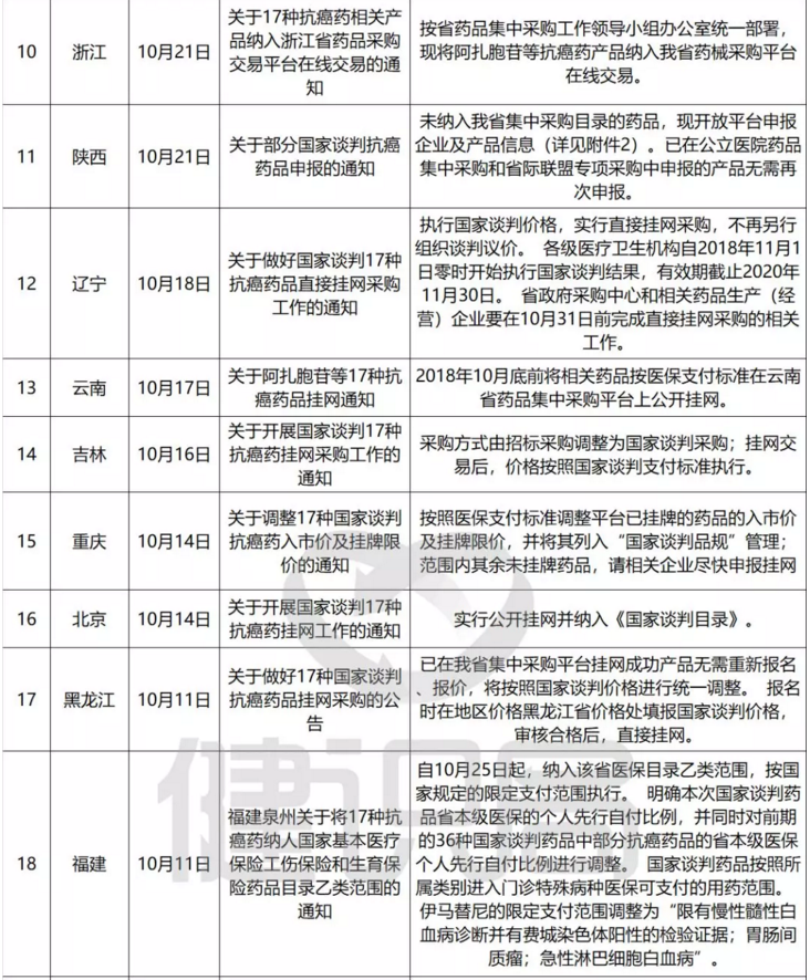 第二天(10月11日)即有2个省份——四川、湖南率先宣布相应产品挂网。据健识君不完全统计,截至目前,至少已有湖北、四川、浙江、黑龙江、福建、天津、贵州、广西、广州等21省(直辖市、自治区)、市落实相关品种开始挂网采购或明确报销比例。按照国家医保局的要求,患者11月底前逐步能买到降价后的抗癌药。