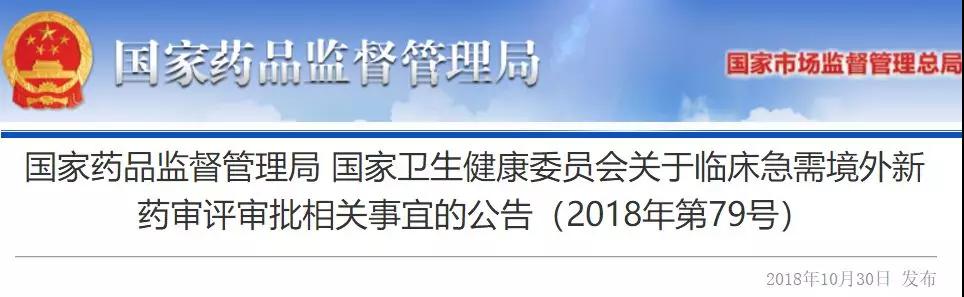 10月30日傍晚,国家药监局和国家卫健委联合发布《关于临床急需境外新药审评审批相关事宜的公告(2018年第79号)》(以下简称《公告》)。