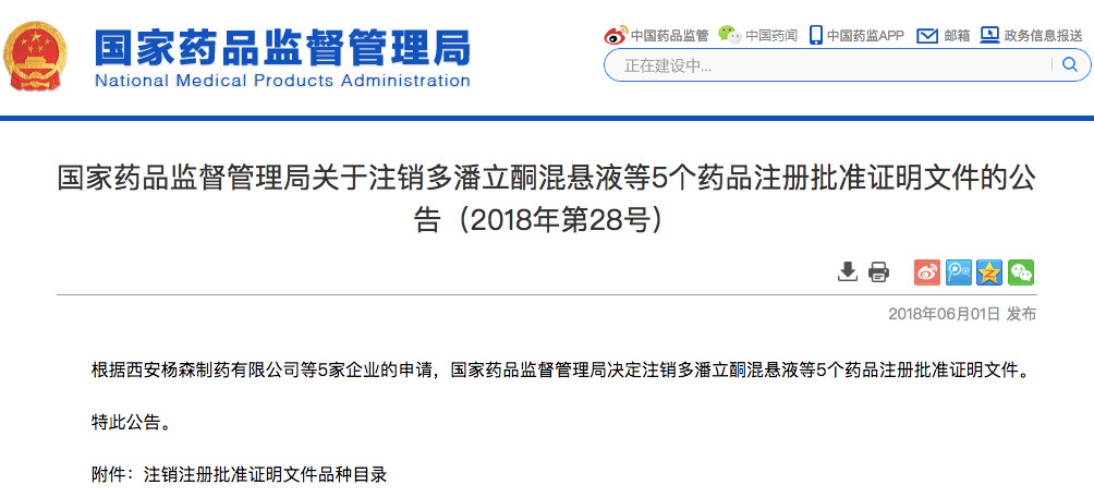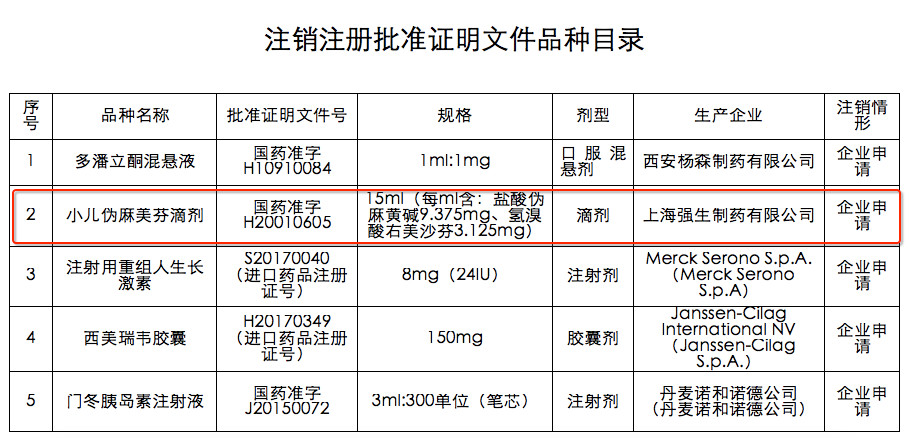 在今年6月1日,国家药监总局已下发《关于注销多潘立酮混悬液等5个药品注册批准证明文件的公告》,企业主动申请注销的药品批文中,就包括了小儿伪麻美芬滴剂。