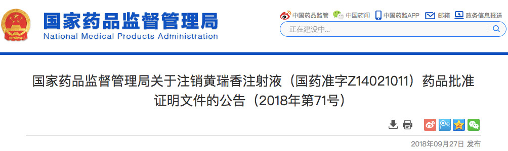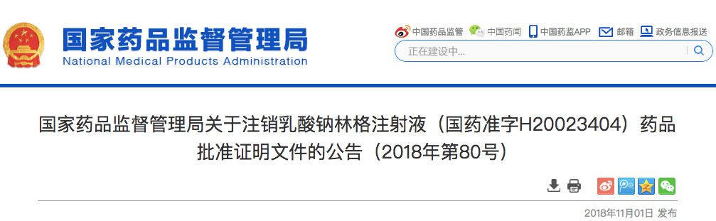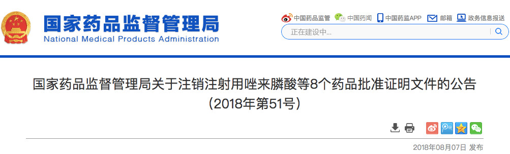 11月2日,国家药监局发布《关于撤销磺胺索嘧啶片药品批准证明文件的公告(2018年第84号)》。