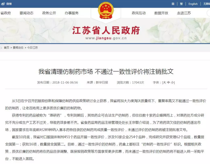 11月6日,江苏省人民政府网转载了新华日报的《我省清理仿制药市场 不通过一致性评价将注销批文》。该文一经发布,在业内引发强烈关注。