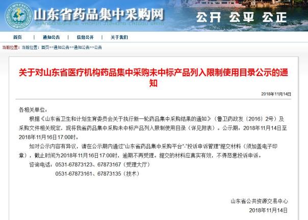 11月14日,山东省公共资源交易中心发布《关于对山东省医疗机构药品集中采购未中标产品列入限制使用目录公示的通知》,将501家药企994个品规、集中采购未中标产品,列入限制使用目录((详见附件))。