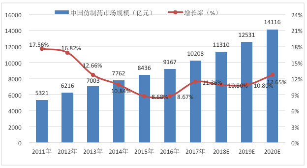 根据《中国仿制药蓝皮书(2017版)》统计数据显示,我国当前仿制药市场规模已经超过了1万亿元,预计至2020年达到1.4万亿。