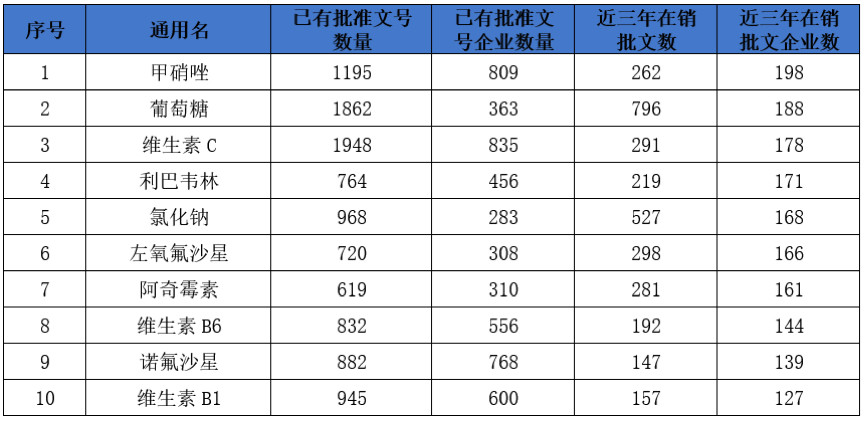 其中,批文数、企业数、近三年在销批文数和在销批文企业数均在120个以上的品种就有10个。有甲硝唑、葡萄糖和维生素C品种的批文数量竟在1000条以上,重复程度之高令人咋舌。