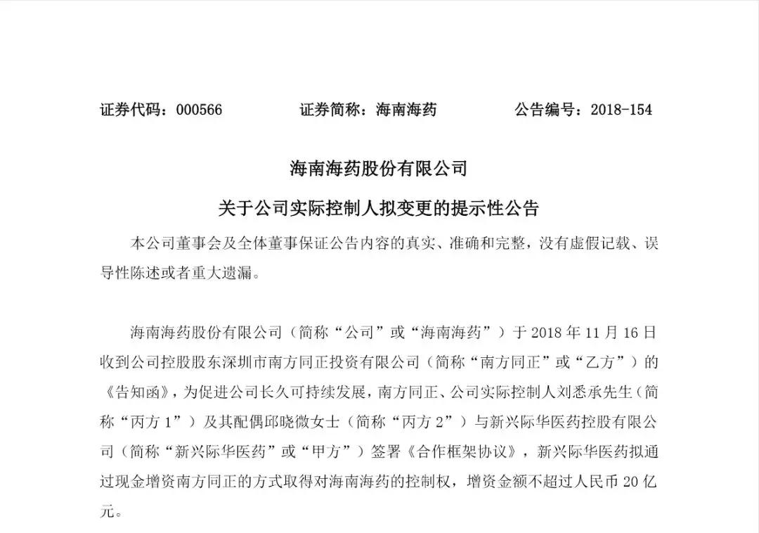 公告显示,海南海药于 2018 年 11 月 16 日收到公司控股股东深圳市南方同正投资的《告知函》。