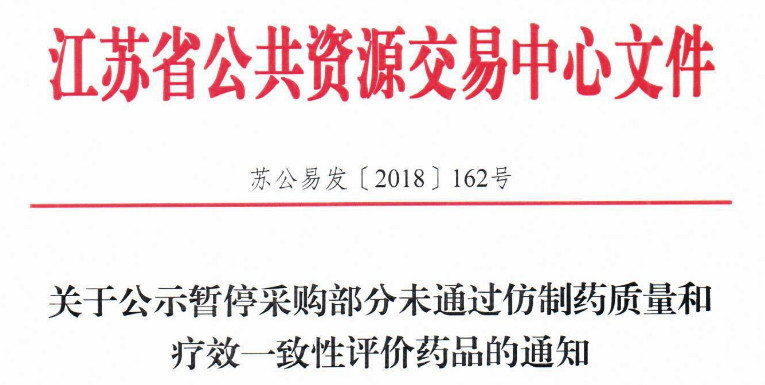 11月22日,江苏省公共资源交易中心发布《关于公示暂停采购部分未通过仿制药质量和疗效一致性评价药品的通知》。