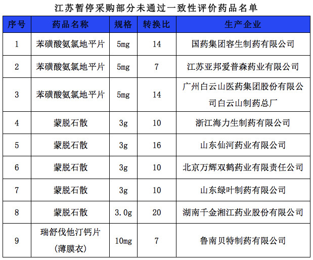 这是江苏省首次发布通知暂停采购未过一致性评价药品。根据通知,有9个药品被暂停采购,共涉及9家药企。具体名单如下: