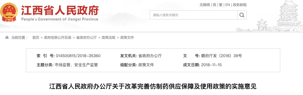 就在11月21日,江西省人民政府官网发布《江西省人民政府办公厅关于改革完善仿制药供应保障及使用政策的实施意见》。