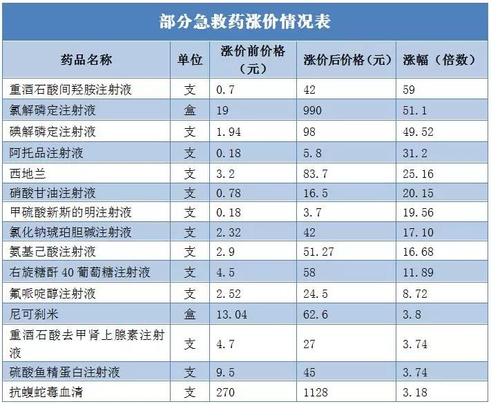 据报道,2015年以来绝大部分急救药均在急速涨价,涨幅少也有3倍,涨幅大的甚至将近60倍。