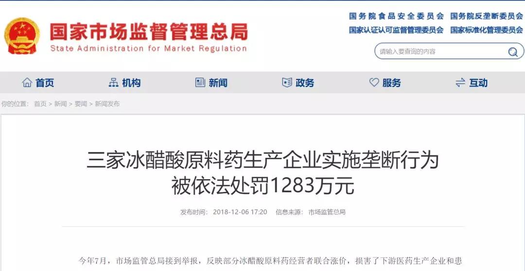 12月6日,国家市场监管总局发布消息“三家冰醋酸原料药生产企业实施垄断行为被依法处罚1283万元”。