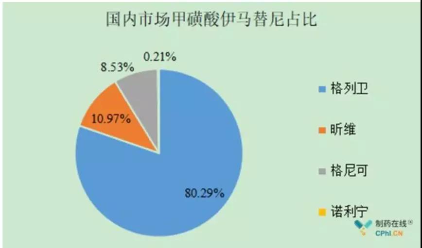 此前,国内市场在售的甲磺酸伊马替尼市场由4家生产企业分割,原研厂家诺华的格列卫市场份额最高,为80.29%。
