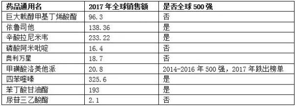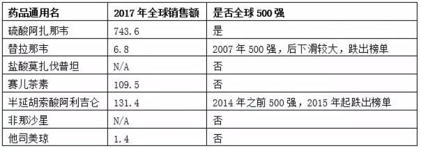 根据中国医药工业信息中心PDB数据库的统计数据,以上7个药品中,2017年只有硫酸阿扎那韦仍在全球销售500强之列。