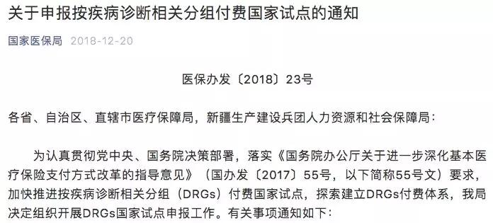12月20日,国家医保局发布《关于申报按疾病诊断相关分组付费国家试点的通知》,明确将加快推进按疾病诊断相关分组(DRGs)付费国家试点,探索建立DRGs付费体系,组织开展DRGs国家试点申报工作。