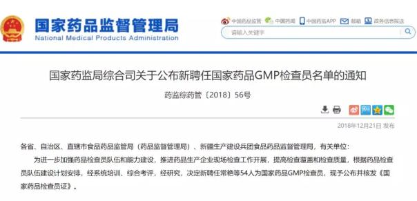 12月21日,国家药监局发布《国家药监局综合司关于公布新聘任国家药品GMP检查员名单的通知》。