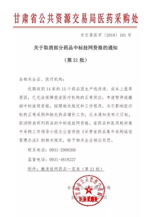 12月25日,甘肃省公共资源交易中心发布《甘肃省关于取消部分药品中标挂网资格的通知(第21批)》,15个药品因生产线改造、成本上涨等原因申请暂停或撤销中标挂网资格。