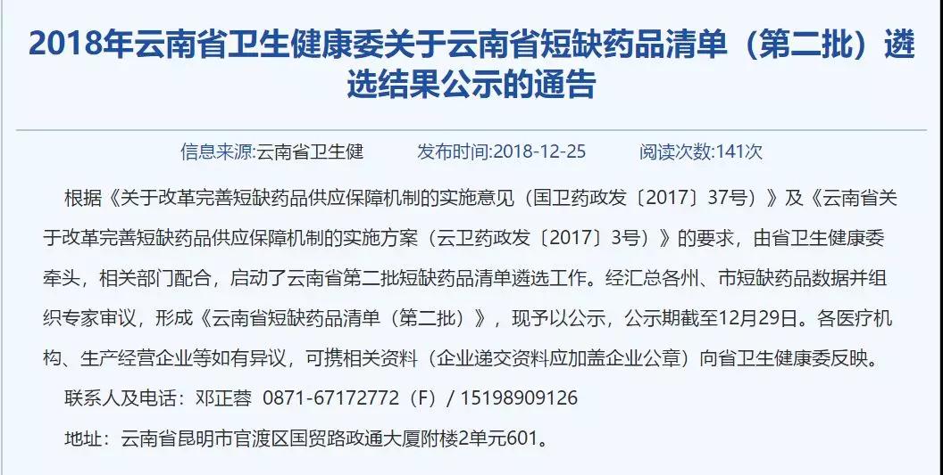 同日,云南省卫生健康委还发布了《关于云南省短缺药品清单(第二批)遴选结果公示的通告》。