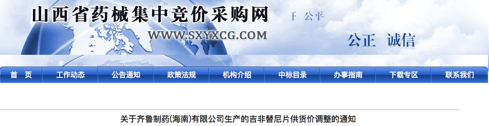 1月9日,山西省药械集中竞价采购网发布《关于齐鲁制药(海南)有限公司生产的吉非替尼片供货价调整的通知》
