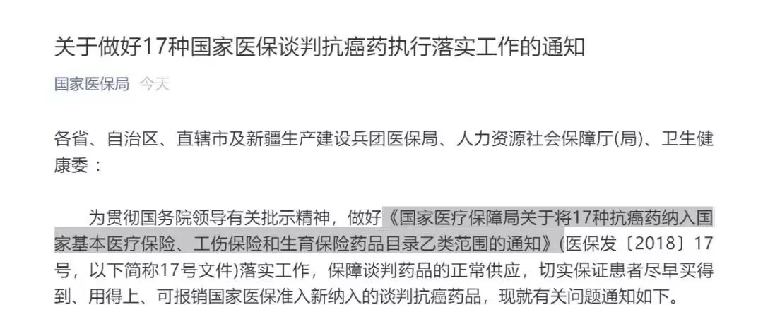 注:2018年11月29日,国家医保局办公室已经联合人社部办公厅、国家卫健委办公厅联合发布《关于做好17种国家医保谈判抗癌药执行落实工作的通知》(以下简称通知)。