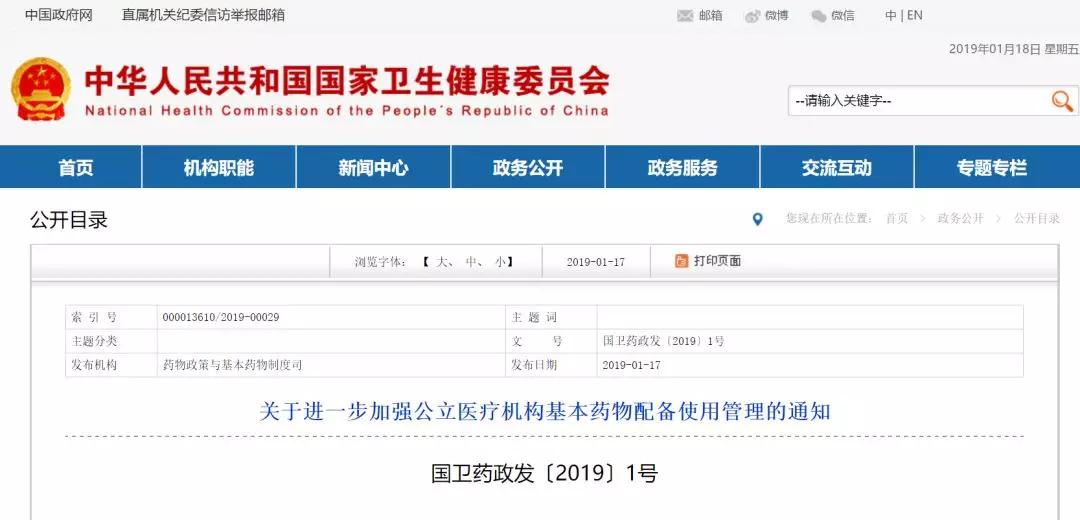 1月17日国家卫健委、国家中医药管理局联合发布了《关于进一步加强公立医疗机构基本药物配备使用管理的通知》国卫药政发〔2019〕1号。