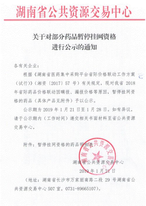 此外,1月21日,湖南省公共资源交易中心发布《关于对部分药品暂停挂网资格进行公示的通知》(以下简称《通知》)。