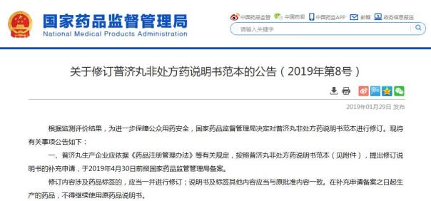 医药网1月30日讯 29日,国家药监局发布了《关于修订普济丸非处方药说明书范本的公告》(2019年第8号),称根据监测评价结果,为进一步保障公众用药安全,决定对普济丸非处方药说明书范本进行修订。