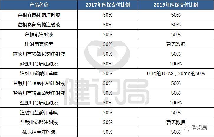 福建医保支付价中,2017年将此类药品定义为万能辅助用药,医保报销限制在50%。2019年笔者查询的磷酸川芎嗪和盐酸川芎嗪的医保报销比例不一。
