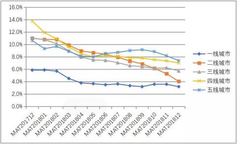 从城市级别来看,大城市市场逐渐饱和,低级别城市市场发展快,四线和五线城市增长速度高于一线、二线发达城市。三线、四线城市基本保持6%以上的增速,高于全国4.85%的增速,渠道下沉是行业发展的主要旋律之一。