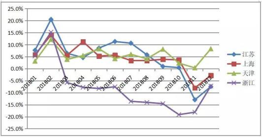 2018年4省月度销售额同比增长率