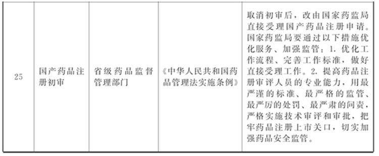 在“国产药品初审注册”项,省级药品监管部门的初审被取消。国务院表示,取消初审后,改由国家药监局直接受理国产药品注册申请。