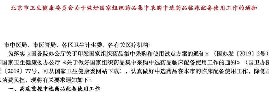 近日,北京市卫健委发布文件《关于做好国家组织药品集中采购中选药品临床配备使用工作的通知》(以下简称《通知》)。