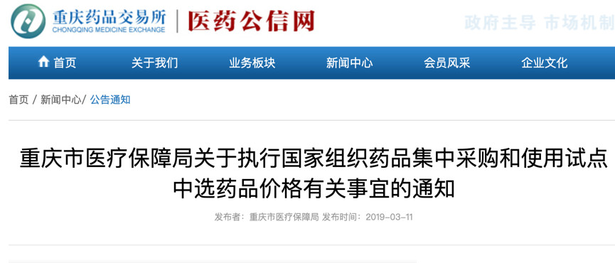 无独有偶,3月11日,重庆市医保局发布文件,规定关于执行带量采购中选药品的有关事宜,其中也对医疗机构做出要求:医院之前采购的存量药品价格与中选药品价格不一致的,在2019年3月20日前可按原采购价格向患者销售,从2019年3月20日0时起,一律按中选药品价格向患者销售。