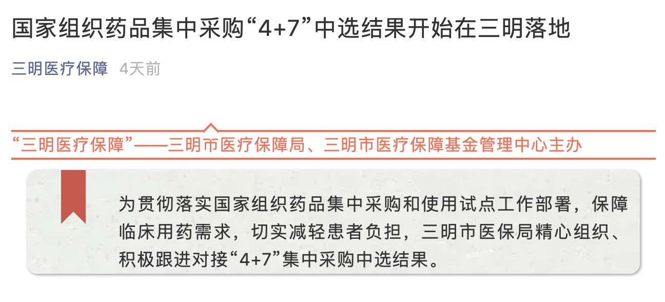 近日,三明市医疗保障管理局、市医疗保障基金管理中心主办的公众号“三明医疗保障”发布消息:国家组织药品集中采购“4+7”中选结果开始在三明落地。